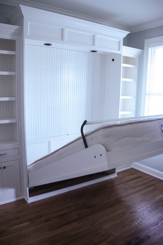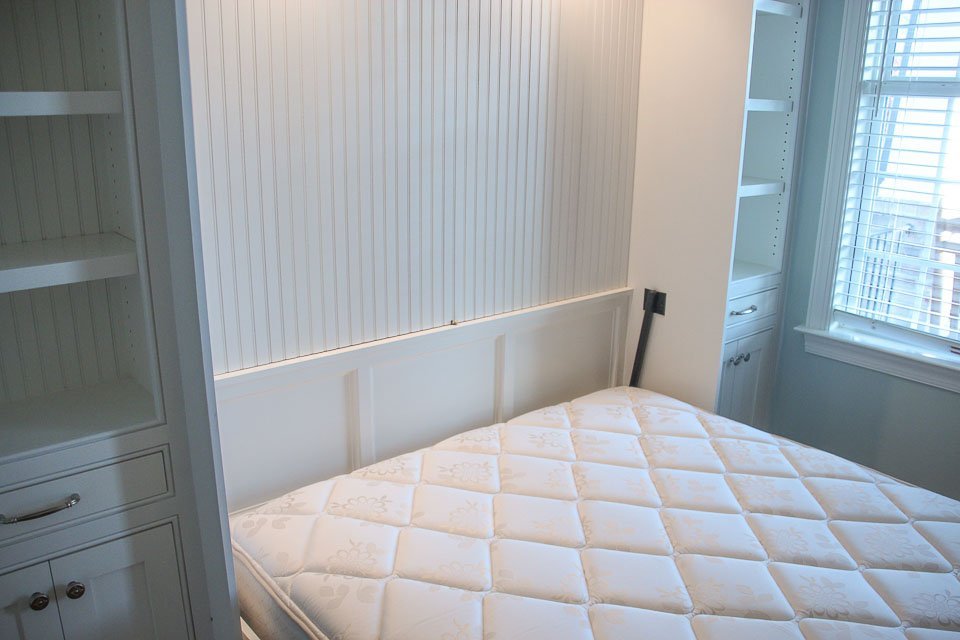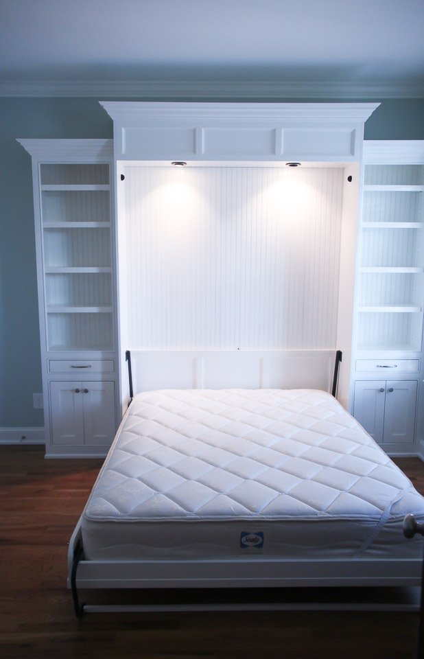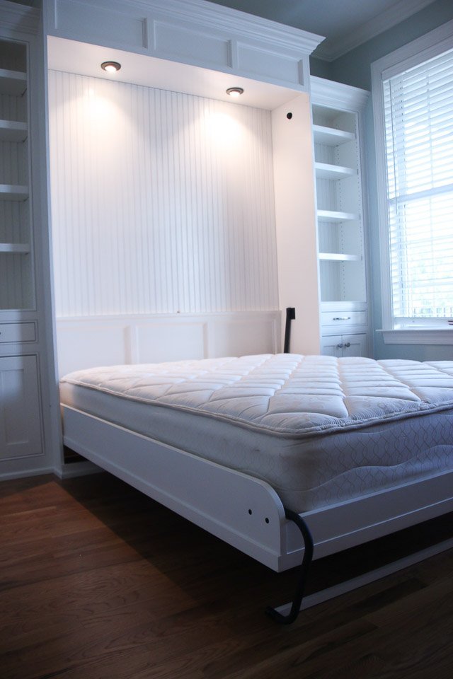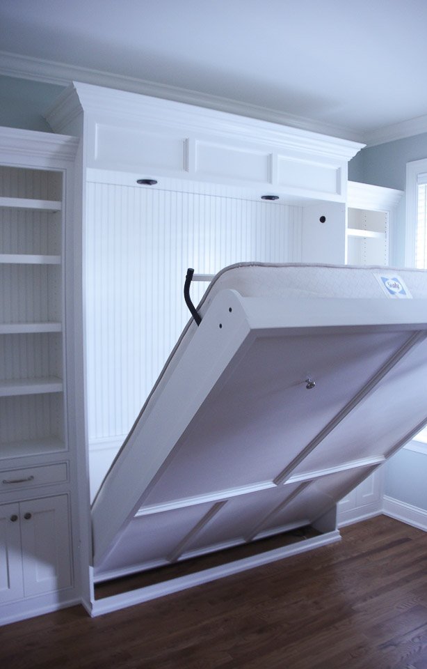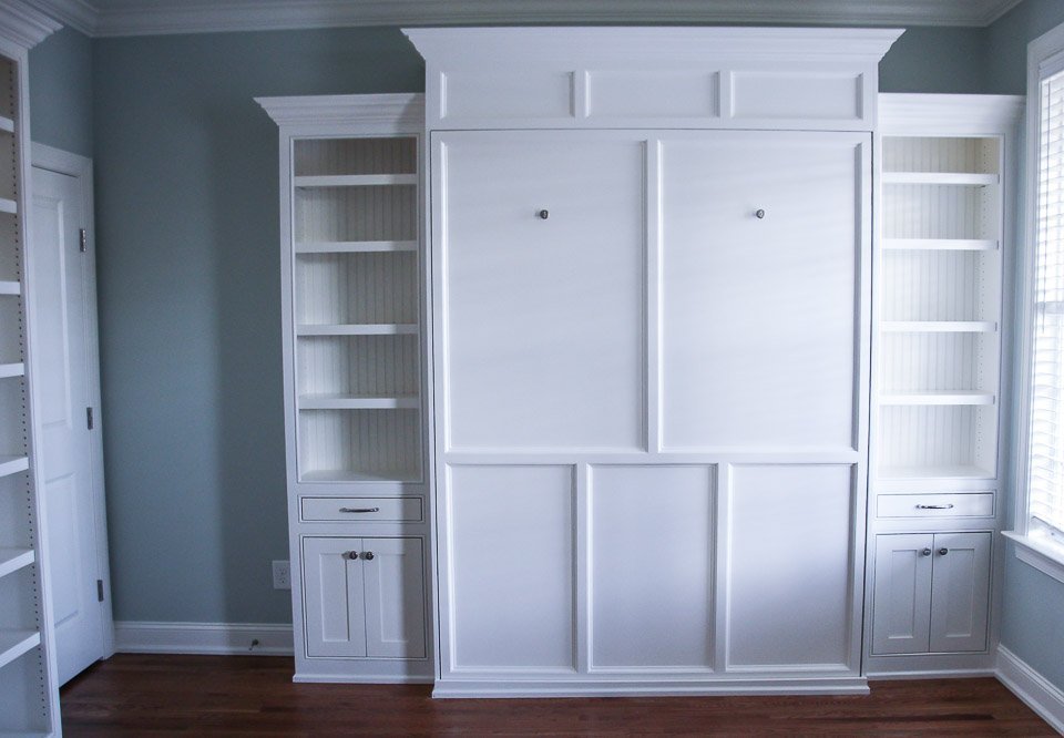 Murphy Bed & Built-In Built-Ins Murphy Bed & Built-In Small home office with custom Murphy bed and wall of shelvesIn this project we designed a Murphy bed and built-in bookshelves for a small home office, that now can be easily transformed into a guest room.We implemented the customer’s design ideas to match the panels of the closed Murphy bed with some trim in their house. A special light-kit was added to provide enough light with easy access for guests. On each side of the bed the customer wanted a nightstand, so we designed a solution in the form of a drawer-shelf. CONTACT US Make The Right Choice Get In Touch Contact us